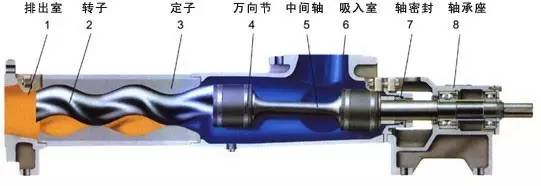 單螺桿泵是一種新型的內(nèi)嚙合回轉(zhuǎn)式容積泵。主要工作部件是偏心螺桿(轉(zhuǎn)子)和固定的襯套(定子)。